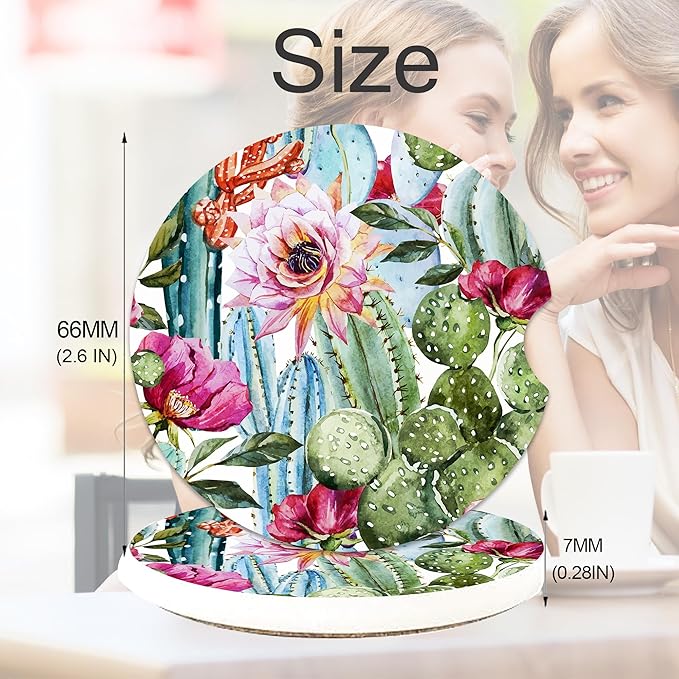 Cactus Pink Roses Flowers Car Coasters for Cup Holders, Car Accessories, 2 Pack Absorbent Ceramic Car Cup Holder Coasters for Drinks, for Women Men, Universal Non-Slip with Finger Notch
