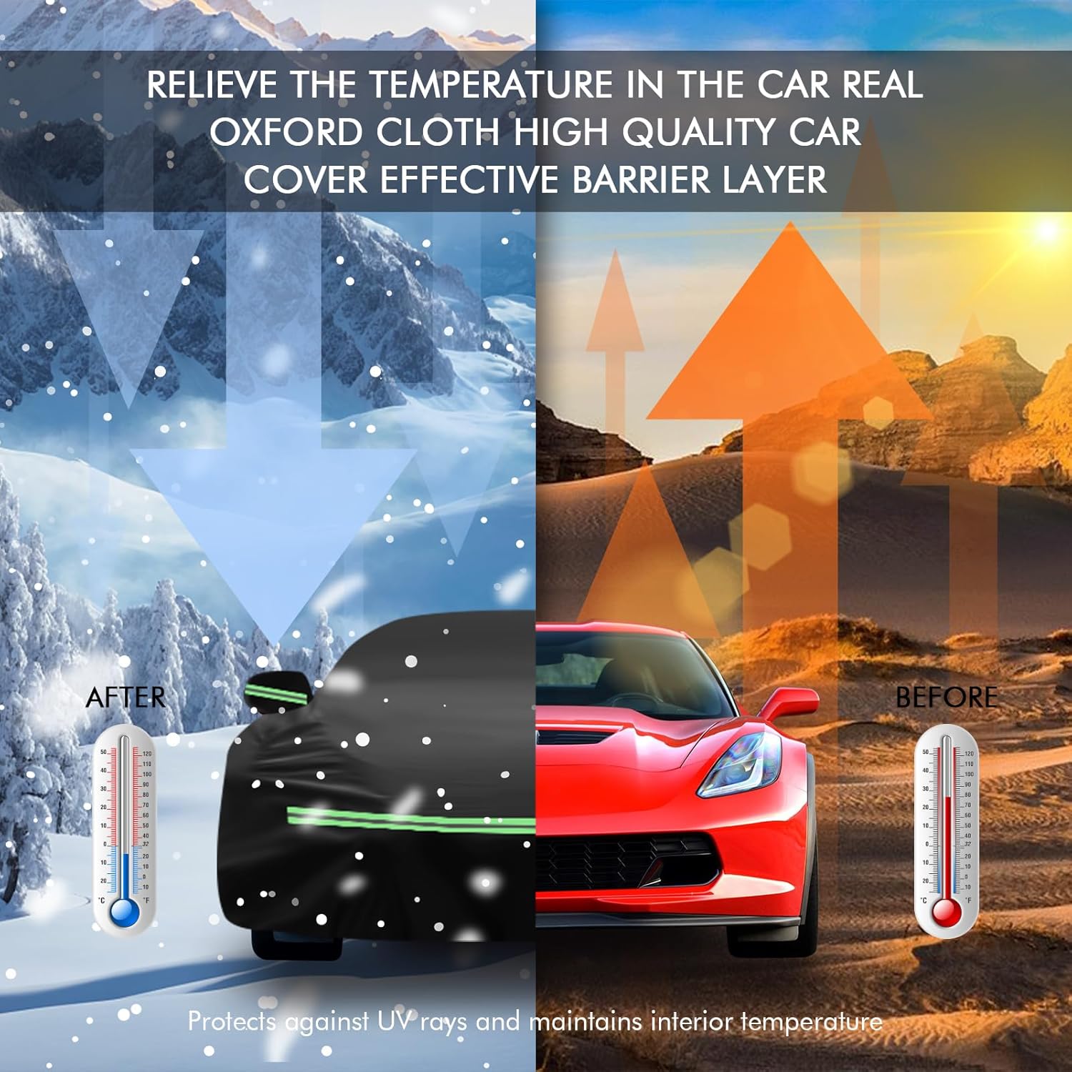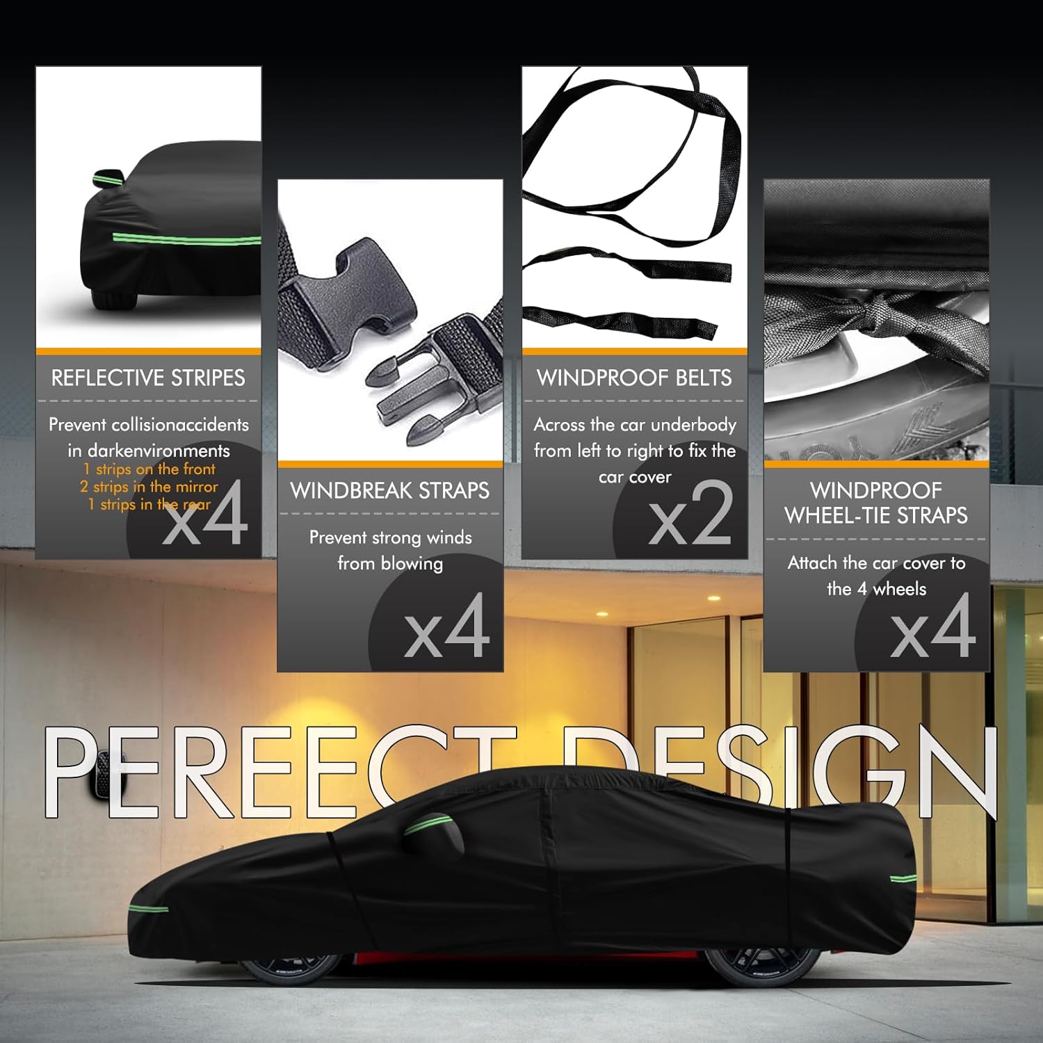 - 🚘【Upgrade Windproof Design】①A windproof fixed buckle pass through the middle of the car for easy fixing; ②Windproof belts at the front and rear; ③4 straps to tie the cover to the four wheels; ④Elastic band at the bottom can easily adjust the size of the cover; ⑤Double stitching ensures that the cover will not tear easily, making it more durable; ⑥The included safety latch secures the cover. Multiple upgraded designs keep your protective cover from being blown away even in strong winds.