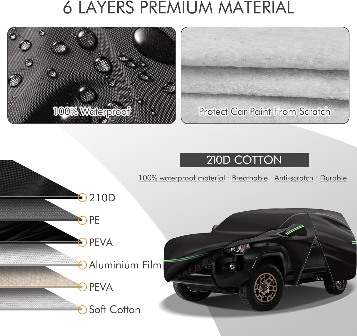 - 🚘【Premium Material】The car cover for Toyota 4runner is made of heavy-duty 210D Oxford cloth and waterproof silver-plated fabric, and has multi-layer cotton coating, which can be windproof, dustproof, UV-proof, sun-proof, not easy to tear, and withstand water pressure up to 1600mm. The inner layer also has a thickened cotton backing, which not only fully prevents the paint from being scratched, but also has thermal insulation, which is warm in winter and cool in summer.