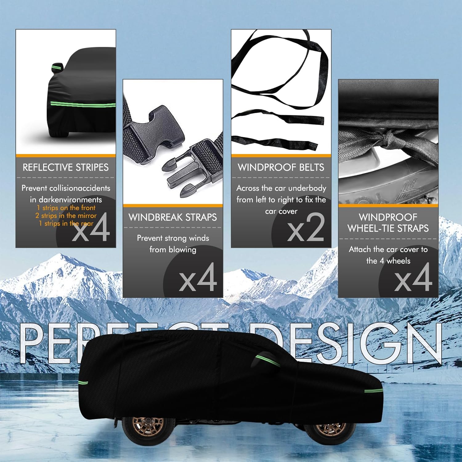 - 🚘【Upgrade Windproof Design】①A windproof fixed buckle pass through the middle of the car for easy fixing; ②Windproof belts at the front and rear; ③4 straps to tie the cover to the four wheels; ④Elastic band at the bottom can easily adjust the size of the cover; ⑤Double stitching ensures that the cover will not tear easily, making it more durable; ⑥The included safety latch secures the cover. Multiple upgraded designs keep your protective cover from being blown away even in strong winds.