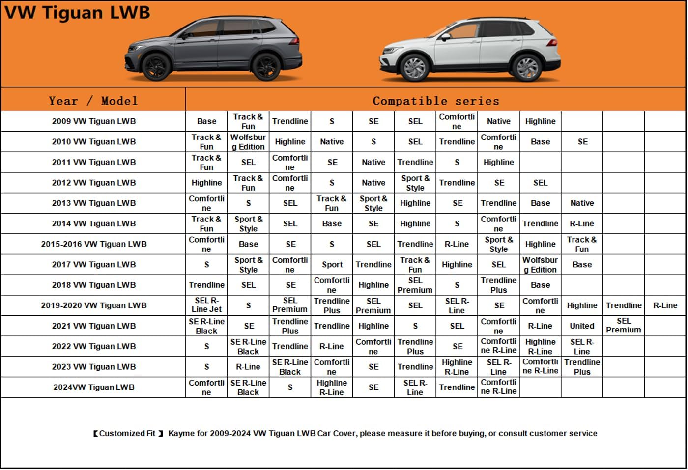 - 【Suitable for】— Custom fit for Volkswagen Tiguan LWB (2018-2025). Come with a large enough portable bag to store your cover when you do not use