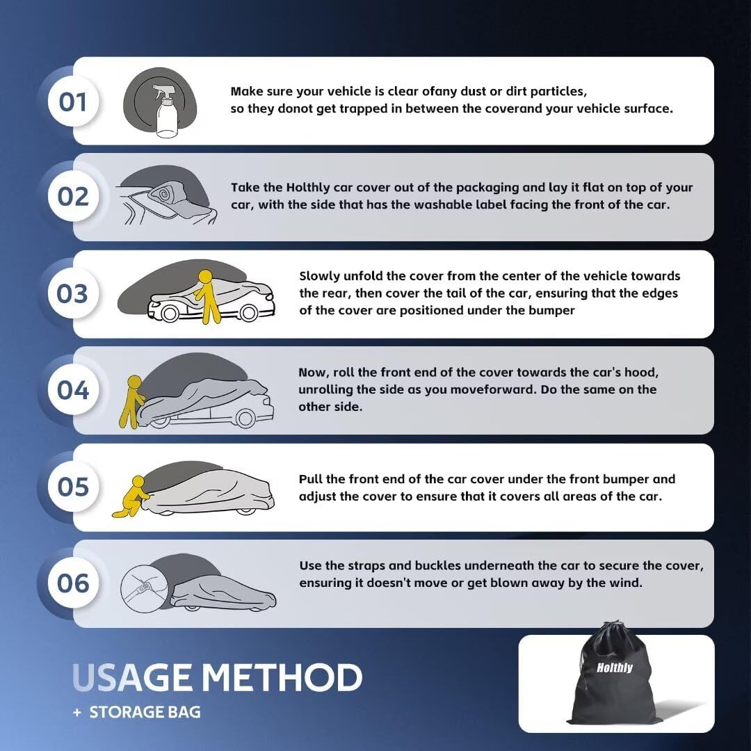 - 【All Weather Protection】- Holthly car cover has all weather waterproof function. Effectively protect your vehicle from water, wind, sun, UV rays, falling leaves, dust. Strong tear resistance and heat resistance and can prevent scratches. Great for indoor and outdoor and even any weather.