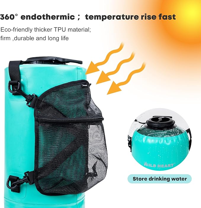 • The shower bag is made of waterproof material TPU through high-frequency voltage technology, which is more durable and can hold drinking water.