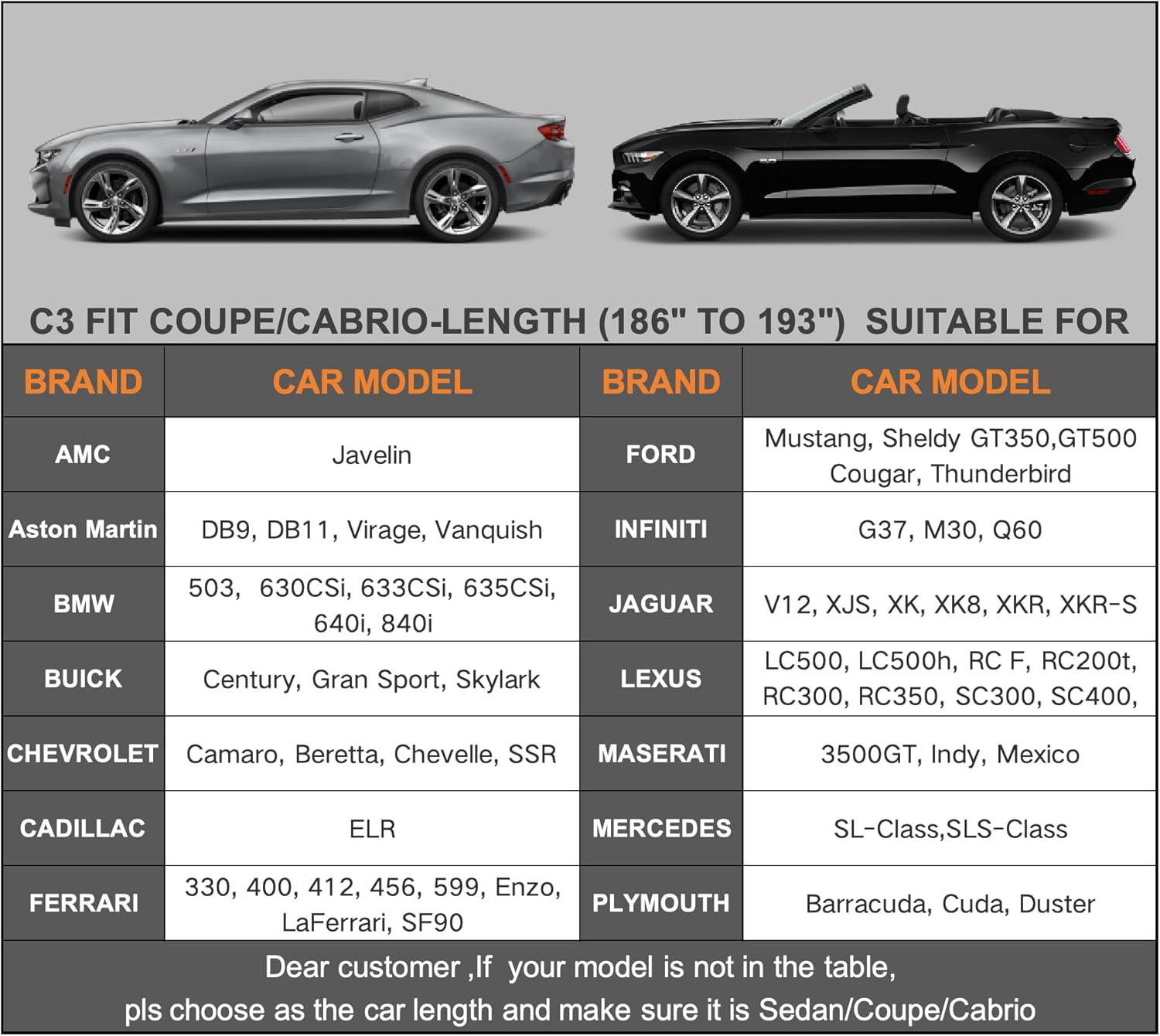 - 【Dimension C3】Universal fit for Coupe/Sedan/Cabriolet which length is 186-193 inch (Not for hatchback and SUV ). Suitable for Ford Mustang,Shelby, Chevy Camaro, Jaguar XK, XKR,Etc.