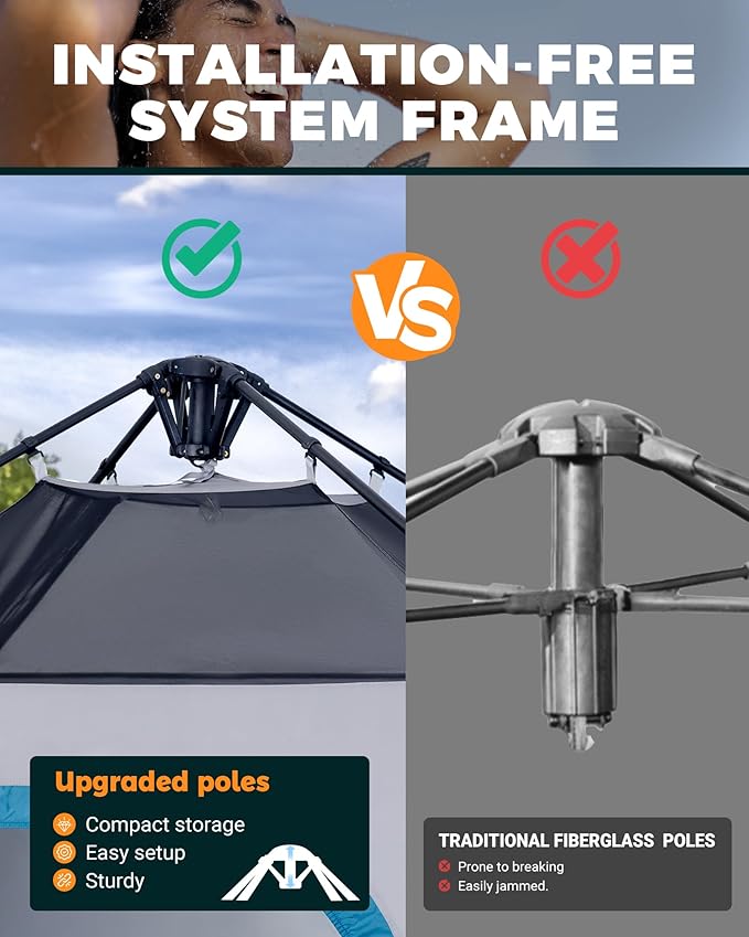 - QUICK SETUP & STORAGE: No tools required! Simply unfold the tent, extend the poles, and listen for the "click" sound to complete the setup. The entire process takes just 60 seconds, offering a hassle-free and quick shower tent experience. Comes with a storage bag for easy transport, with packed dimensions of 44" x 8" x 8".