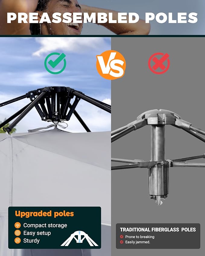 - QUICK SETUP & STORAGE: No tools required! Simply unfold the tent, extend the poles, and listen for the "click" sound to complete the setup. The entire process takes just 60 seconds, offering a hassle-free and quick shower tent experience. Comes with a storage bag for easy transport, with packed dimensions of 44" x 8" x 8".