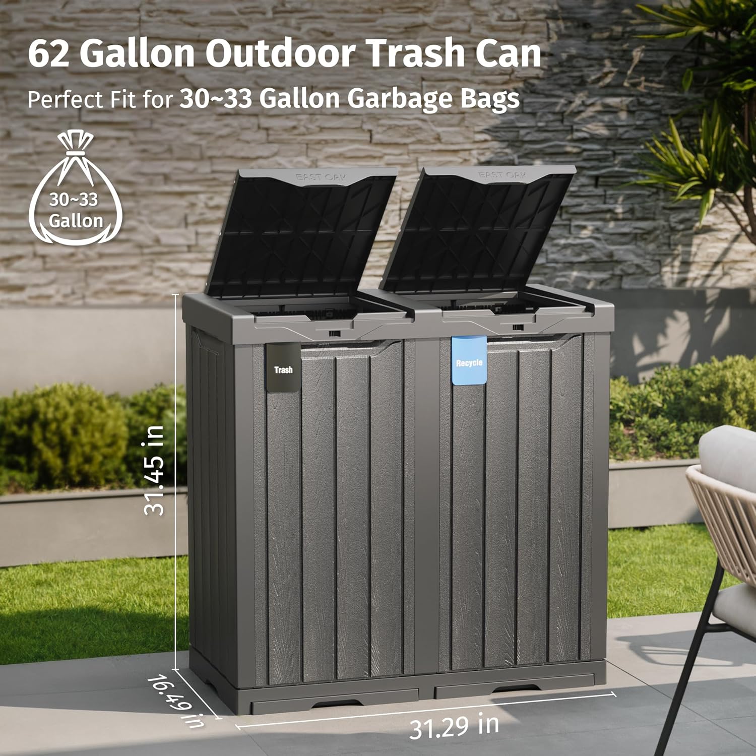 EAST OAK 62 Gallon Outdoor Trash Can | Waterproof Resin Garbage Can with Recycle and Garbage Labels | Secure Bag Lip Lock and Drip Tray | Outside Trash Bin for Patio | Kitchen, Backyard or Deck | Gray