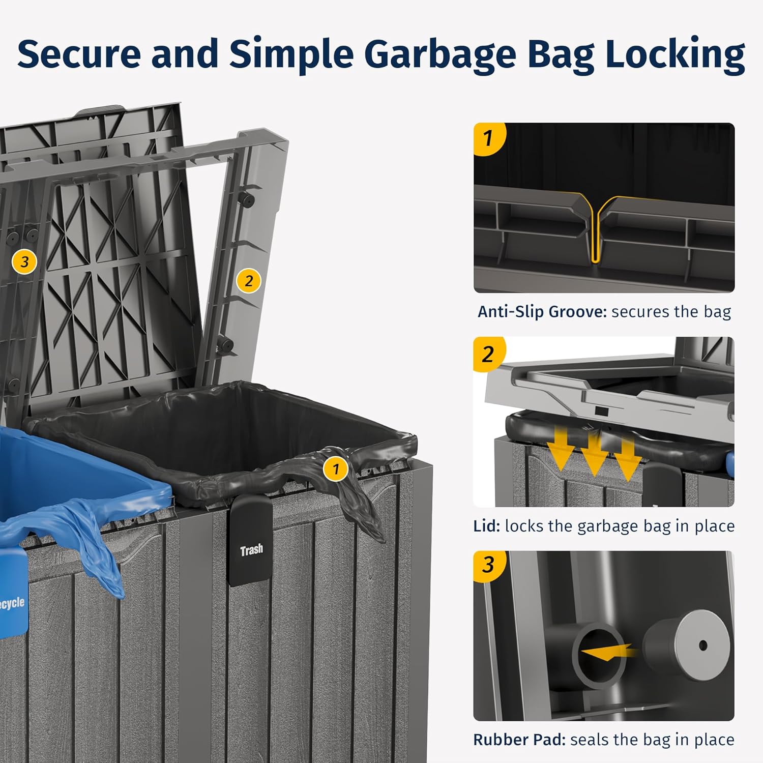 - ๐๐ป๐ต๐ฎ๐ป๐ฐ๐ฒ๐ฑ ๐จ๐๐ฒ๐ฟ ๐๐ ๐ฝ๐ฒ๐ฟ๐ถ๐ฒ๐ป๐ฐ๐ฒ: Our outdoor trash can for patio has a double-layer lid and rubber cushions to keep the garbage bag secure, even when itโs full and heavy. The inner ribbed structure ensures easy removal of the bag without tearing or scratching