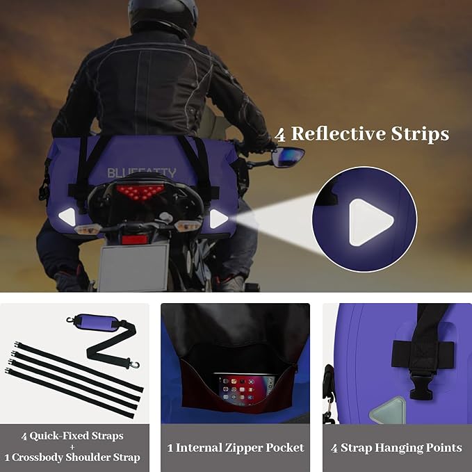 - Safe Design: The motorcycle duffle bag contains a total of 4 high brightness reflectors, which can provide you with good security protection for night travel. Comes with a removable shoulder strap and two side handles, you can carry it by hand or crossbody.