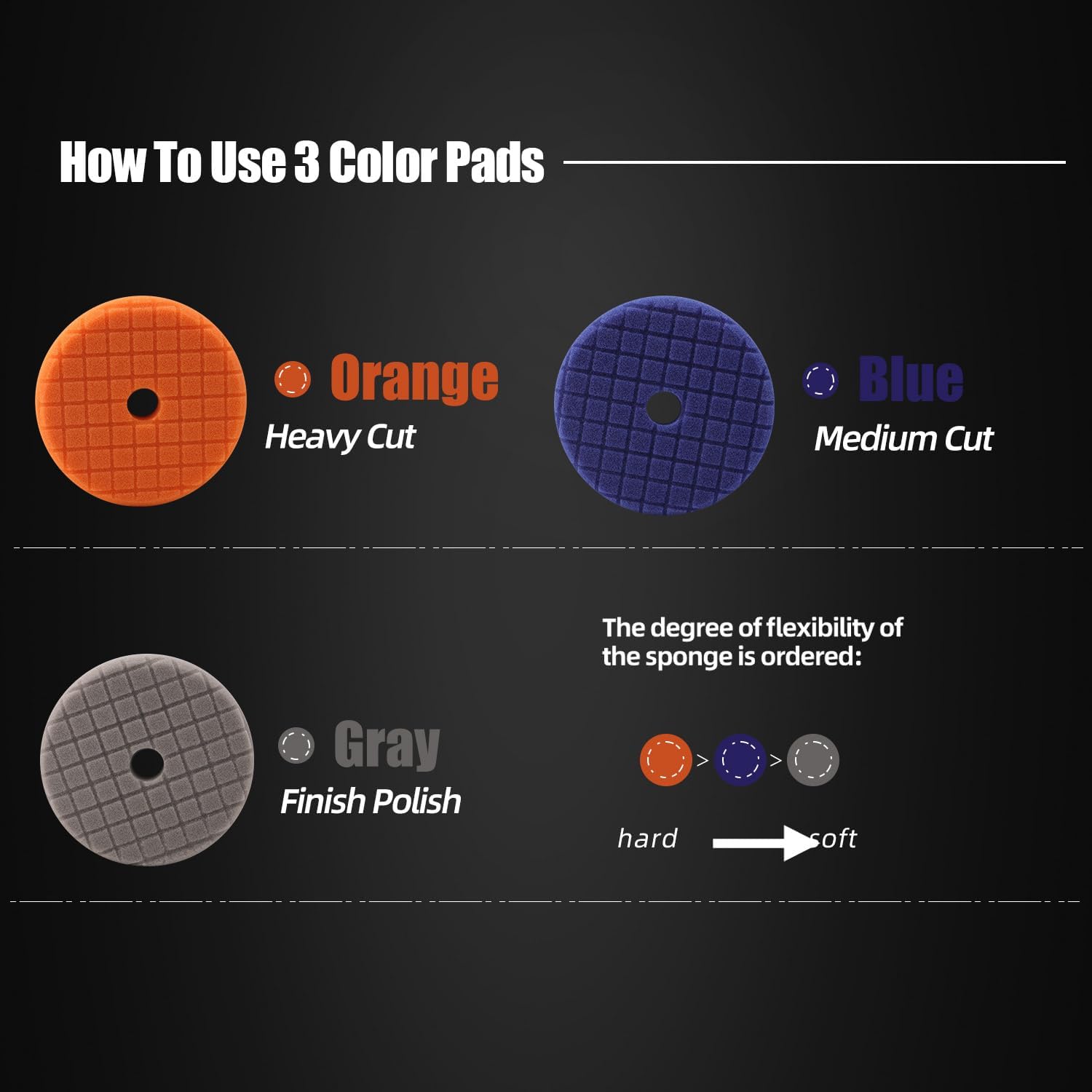 - Usage: the sponge pads come in three colors: orange for heavy cuts, blue for medium cuts, and gray for fine polishing and oiling. Suitable for removing car scratches, headlight wear, etc. to achieve the ideal polishing effect.
