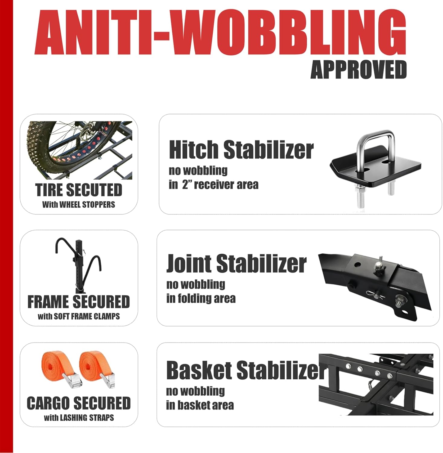 - SAFE & STABLE: Soft frame clamps, 2 lashing straps and wheel stoppers keep bikes and cargos safe during transport. Three stabilizers prevent rattling and wobbling on the road