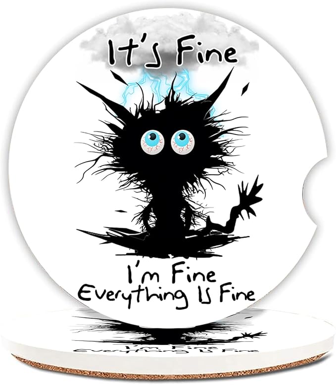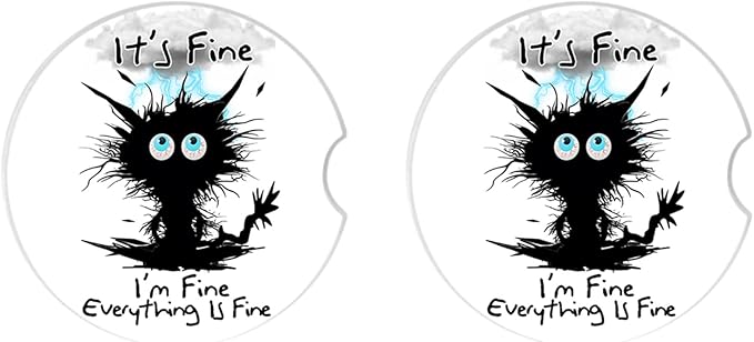 Car Coasters 2 Pack, Small 2.56" Ceramic Stone & Non-Scratch Cork Base Car Cupholder Absorbent Coaster Set for Women/Men Drink Cup Holder Coasters (I'm Fine Cat) BD-10