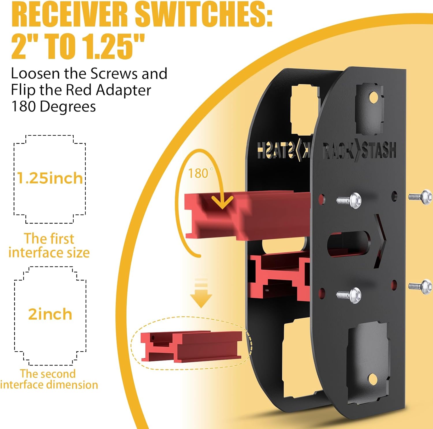 - Adjustable Receiver : This wall mount hitch can adjust from 1.25" to 2". Just loosen the screws, flip the red adapter, there's no need to remove it from the wall.Suitable for bike rack / cargo carrier / ski rack / hitch step.