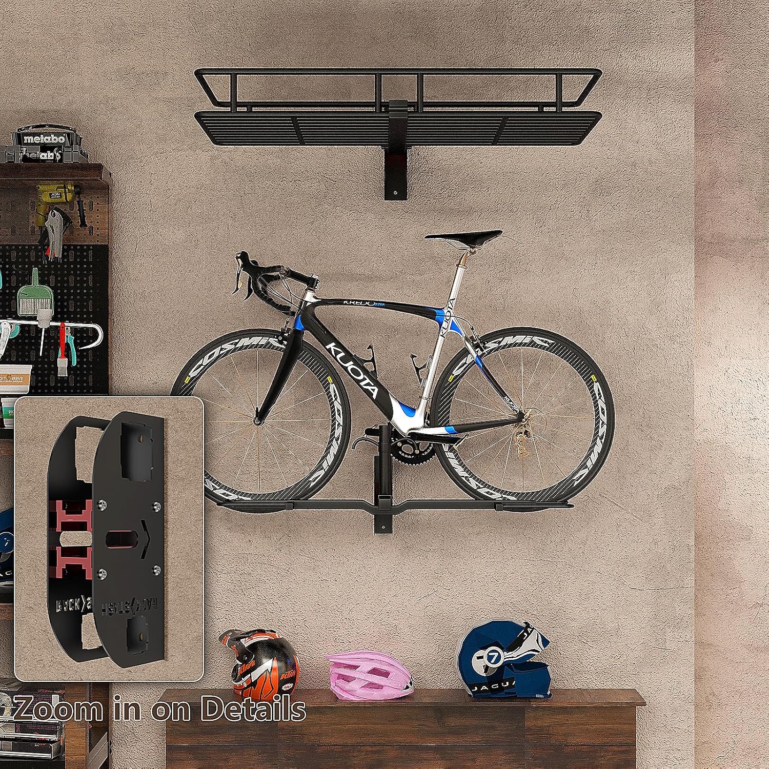 - Space-Efficient : Use a wall-mount hitch storage rack to store your hitch bike rack, no more tripping over hitch bike racks sitting on the floor, tidying up the garage and improving garage storage space.Besides, there are two 1.25" and two 2" accessory holes on the side for you to store a variety of accessories