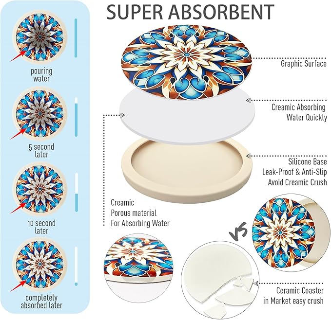 - Anti-slip design: Our silicone layer prevents coasters from sliding on any surface. Enjoy worry free of use, protect your desk or table from scratches and watermarks, and no stains left.