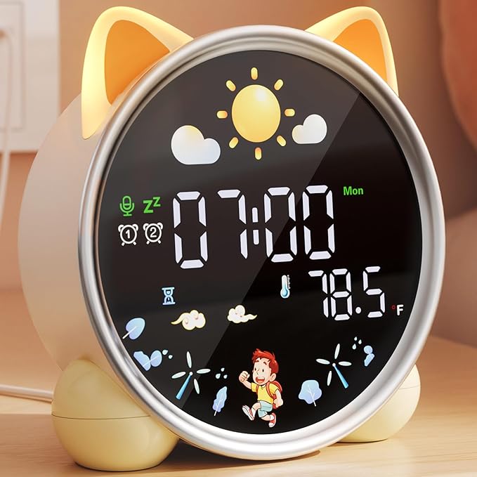 - Alarm Clock for Kids Sleep Trainer: Winshine has created a delightful cat-themed digital alarm clock designed specifically for children, aiming to teach them the concept of time. Our OK-to-wake clock for kids allows you to set reminders for waking up and going to bed. The clock's ambient light and icons will indicate when it's time to rise or rest. The green light and sun icons signify waking up, while the blue light and moon indicate it's time to sleep.