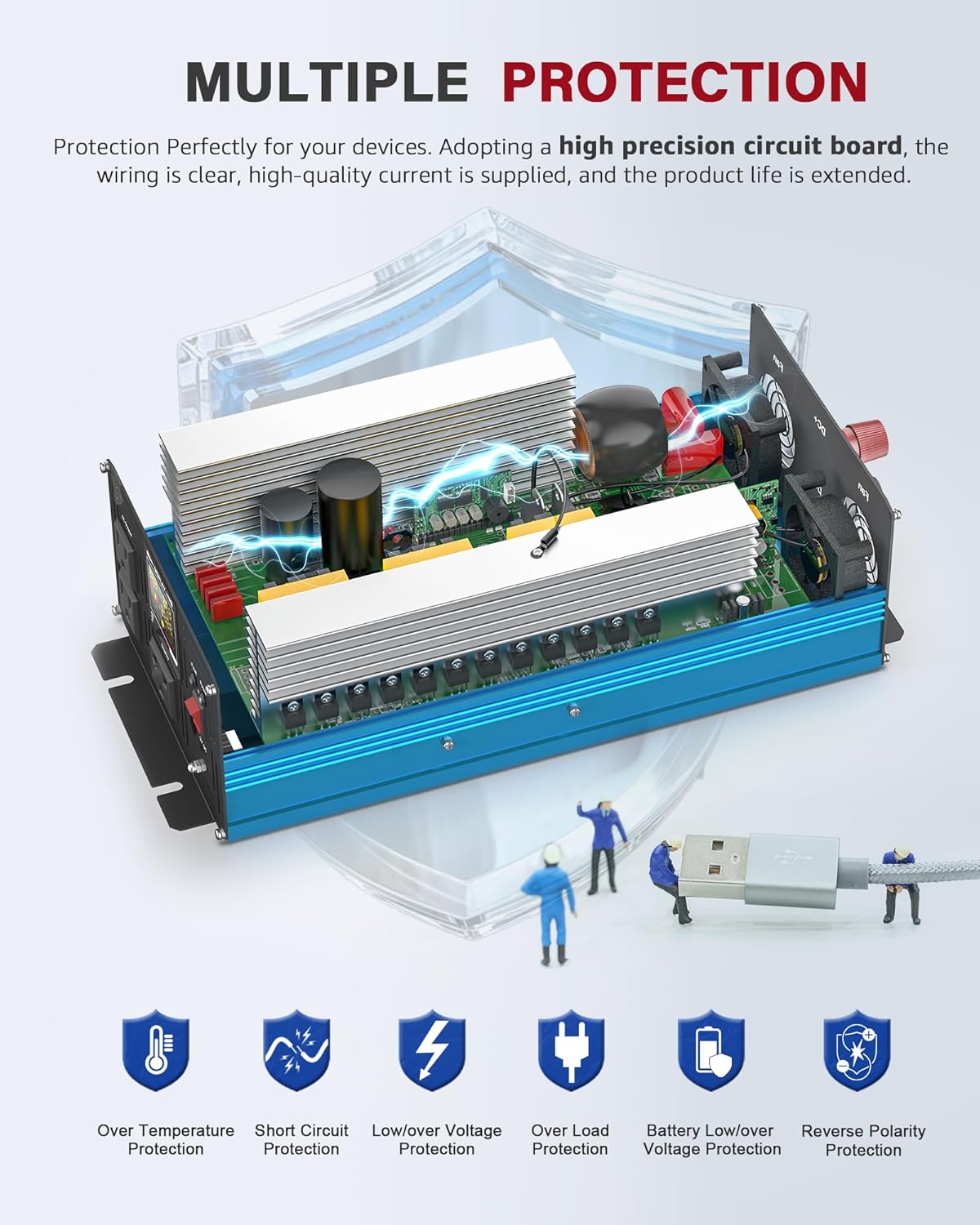 - 【PURE SINE WAVE & LOW ENERGY COMSUMPTION】 LCYMW high-quality 2000 watt inverter is a pure sine wave inverter with 3 AC outlets and 1 2.4A USB ports, which is suitable for most household and car appliances. The pure sine wave power inverter has higher conversion efficiency and greatly reduces the conversion consumption,the inverter output efficiency can be up to 90%.