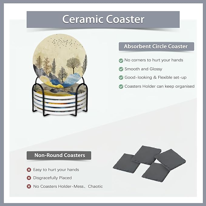 - 【Coaster with Metal Holder Set】The set includes 6 round ceramic coasters and metal coaster holder.