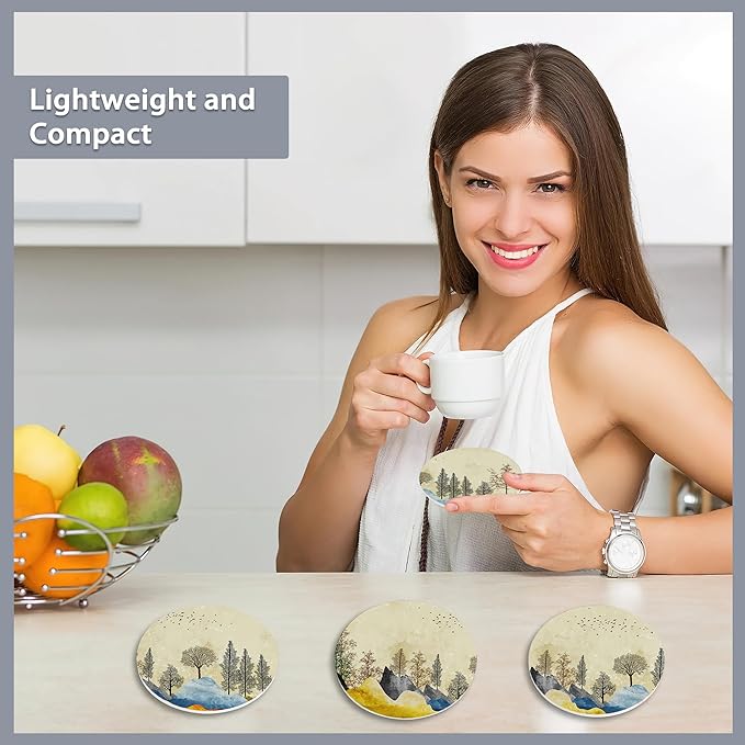 6 Pcs Coasters for Drinks with Holder,Brown Trees with Golden Gray Mountains Landscape Absorbent Coaster with Cork Backing,Great Gift for Housewarming,Room Decor,Bar,Holiday Party