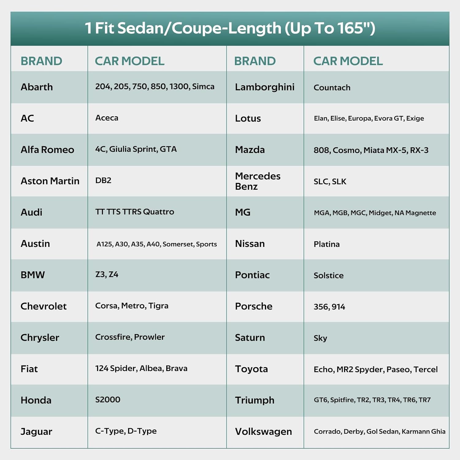 - 【CHOOSE THE RIGHT MODEL】: Molebt coupe car cover fits Sedan & Coupe up to 165 inch. For example BMW Z3,Honda S2000, Mazda Miata/MX-5, Toyota MR2 Spyder/Tercel, Saturn Sky, Pontiac Solstice, Chrysler Crossfire, Volkswagen Cabrio, etc.