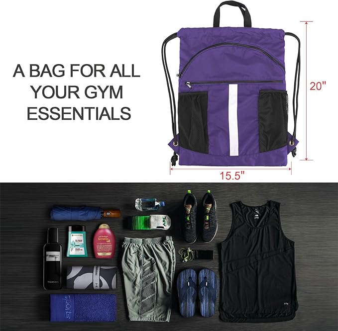 - Convenient Multi Pockets: The big shoe compartment in front of draw string sport bag can hold two pairs of shoes; the smaller zipper front pocket is perfect for keeping an ipad, towel, and other items, besides, two sides mesh bags allow you to place a water bottle, umbrella easily. Inside of cinch bag, the zipper pocket can hold small valuables such as wallet, cellphone, keys and so on. Multiple Pockets help you to keep things to be placed by category, easy to be found.