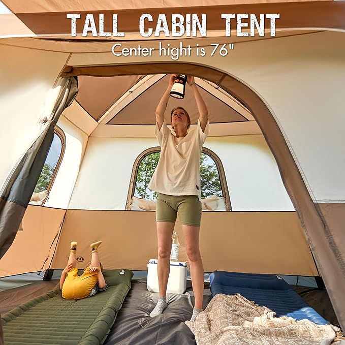 - Roomy Interior & 76" Tall: Measuring 10' x 9' x 76", this 6 person tent fits 2 queen size air mattresses or 6 sleeping bags. The 76" center height ensures enough space for standing and comfortable movement inside the tent.