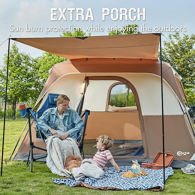 - Tent with Porch: This camping tent features a front porch measuring 71" x 78" with an adjustable height up to 67". Enjoy outdoor activities protected by the porch whether it's sunny or rainy.