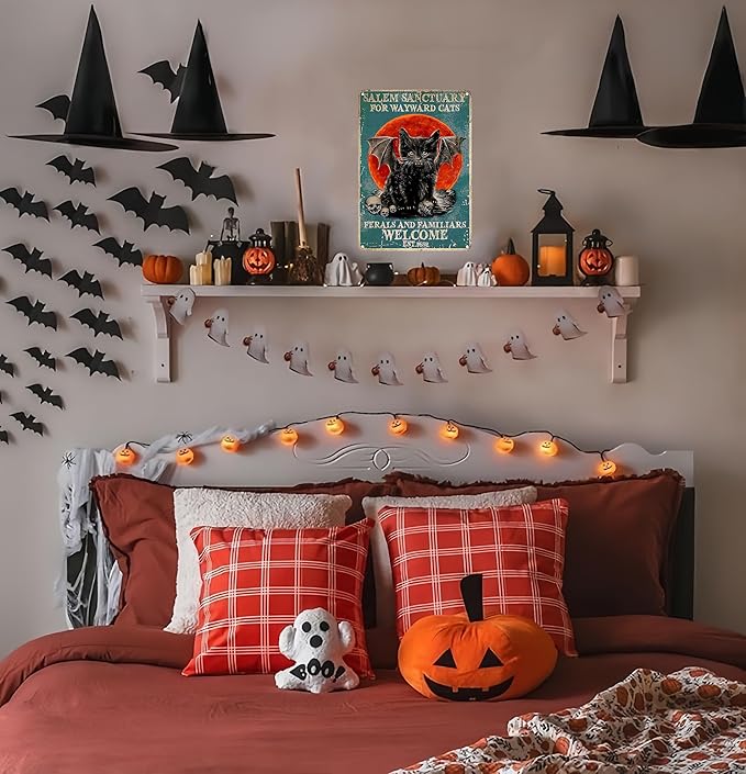 - Spooky Vintage Design: Featuring a haunting "Salem Sanctuary for Wayward Cats" slogan and a black cat illustration, this vintage tin sign adds an eerie charm to your Halloween decor.