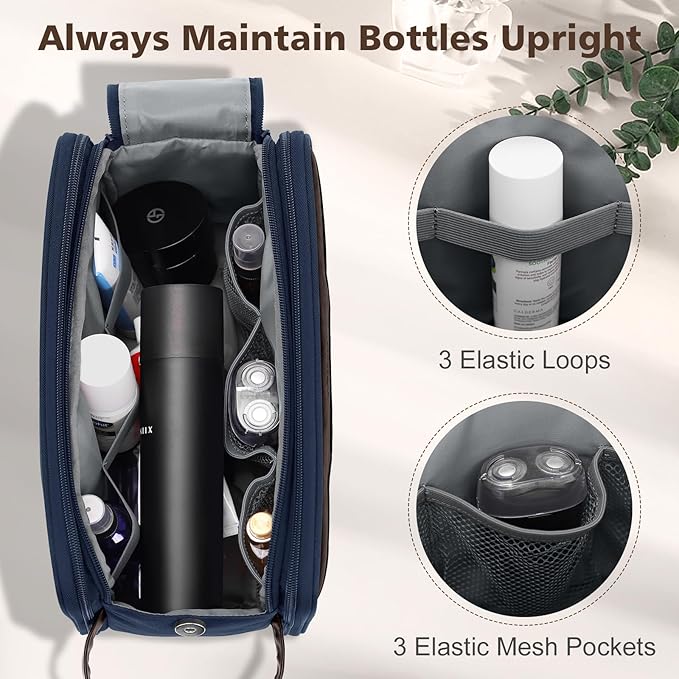 - Neat and Organized: The travel toiletry bag is designed with double zippers, allowing for an easy access to inner contents. The main compartment with a firmly magnetic buckle, increasing the closure of the toiletries bag. The 3 compartments with elastic straps can be hold bottles of various shapes and keep items upright, also putting cords and other items, keeping all your items organized.