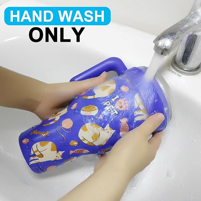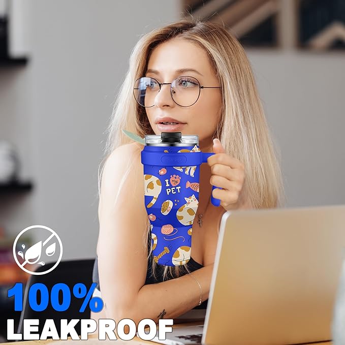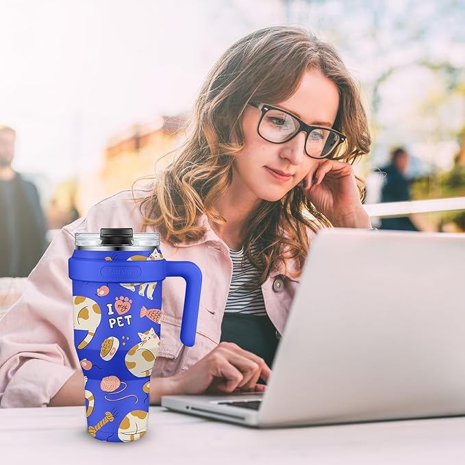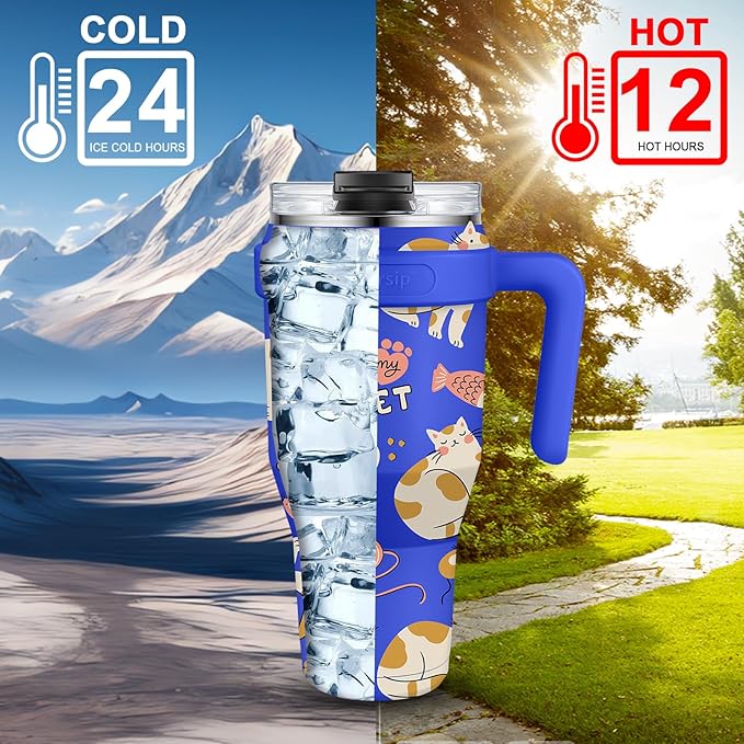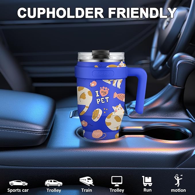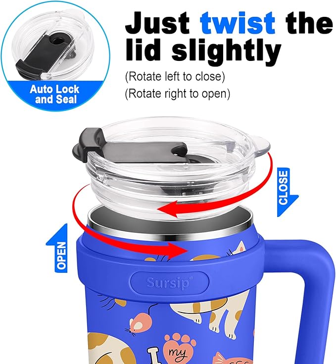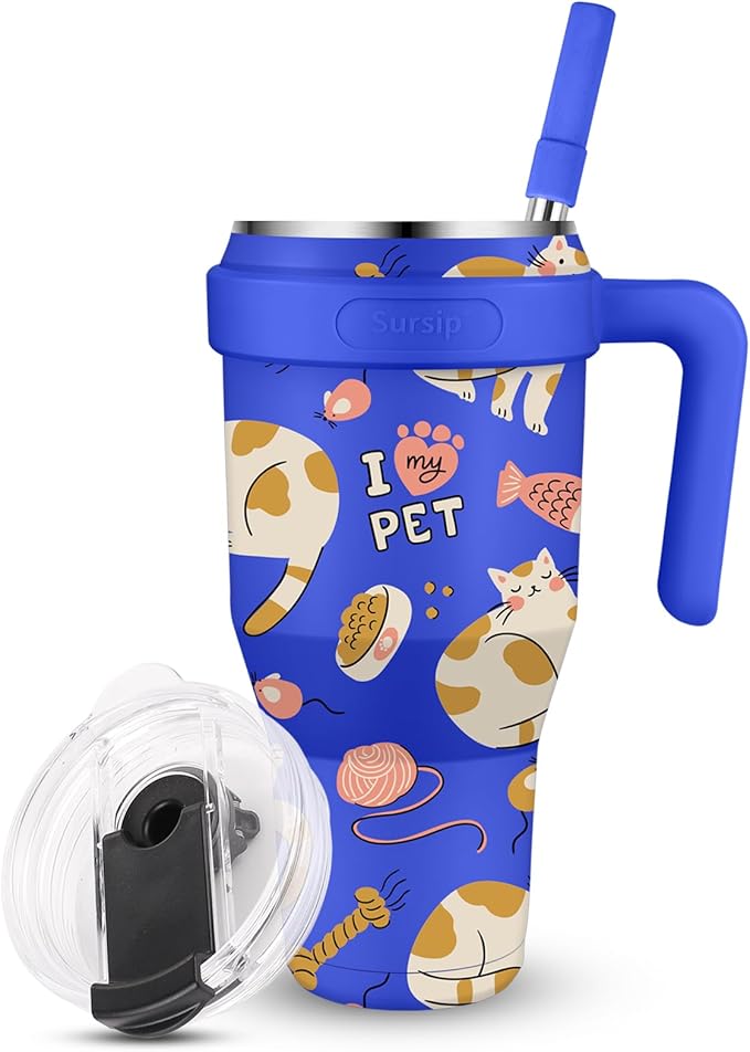 Sursip 40 oz Insulated Tumbler with Screw Lid - Stainless Steel Vacuum Cup with Straw and Handle, For Cold/Hot Drinks - Sweat/Leak Proof, Fits Cup Holder, Ideal Gifts for Women/Men (Blue Cat)