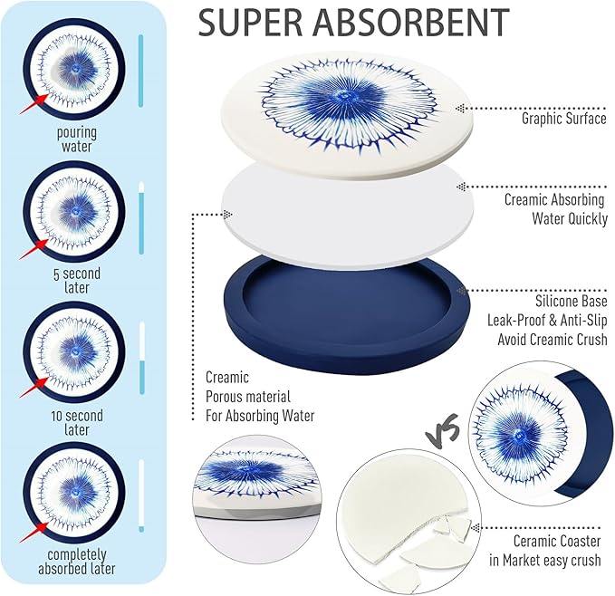 - Anti-slip design: Our silicone layer prevents coasters from sliding on any surface. Enjoy worry free of use, protect your desk or table from scratches and watermarks, and no stains left.