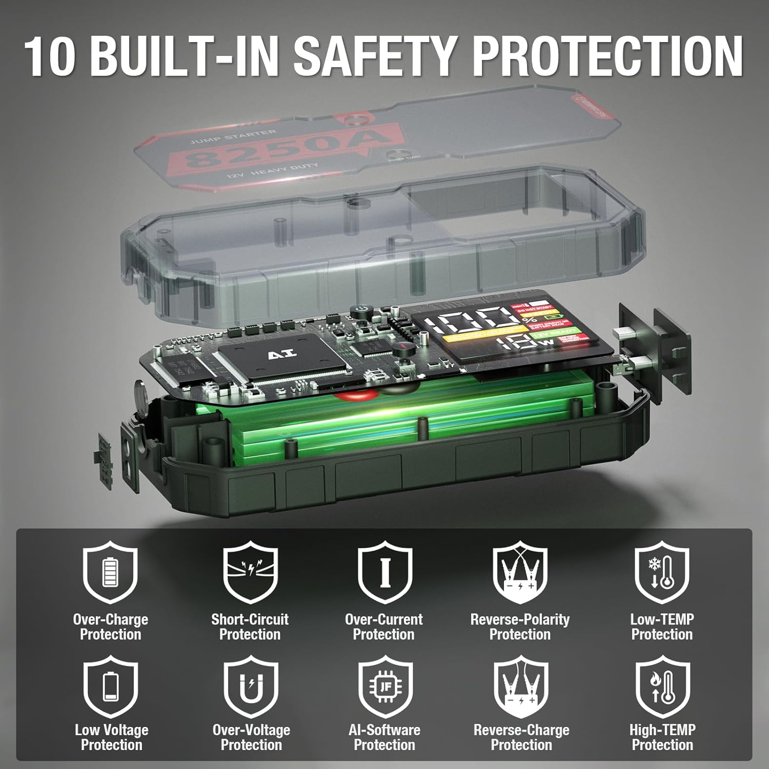 - 【START COMPLETELY DEAD BATTERIES】: This car jump starter delivers a powerful 8250 Amps peak current, capable of reviving completely dead batteries in vehicles up to 10L Gas/8L Diesel engines. With up to 60 jump starts on a single charge, this portable battery jump starter ensures you're never stranded.It jump starts almost every type of vehicle and equipment, including motorhomes, coaches, buses, mining, agricultural, construction, and vocational equipment - 6, 8, 12, and 16 cylinder - and more.NOT Suitable for Heavy Duty Truck.