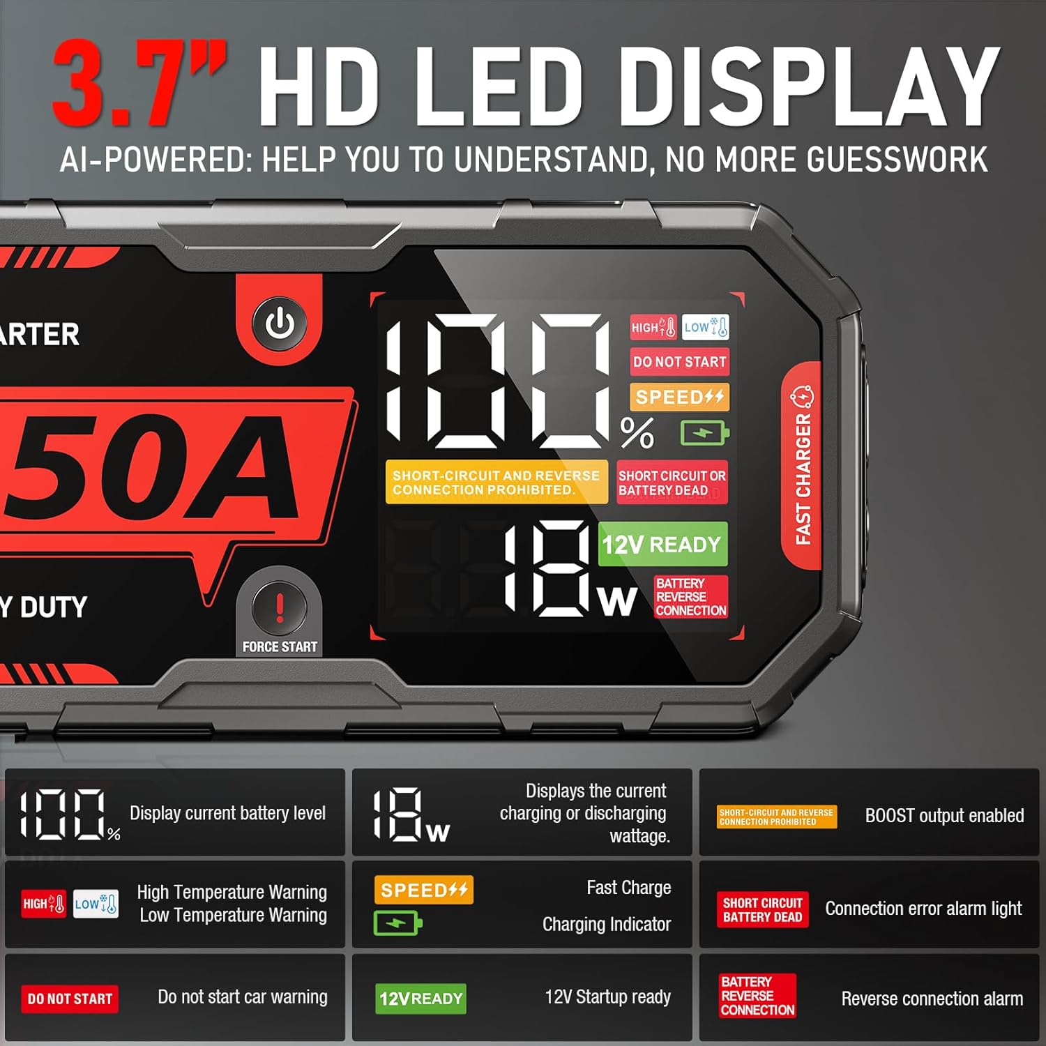 - 【3.7" HD LED Display】This battery jumper starter portable has a 3.7" smart colorful screen provides you with all the intuitive information about operational status, battery level and possible errors at a glance! so you can know when to start the car intuitively.