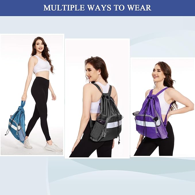 • MULTI-POCKETS: Our drawstring gym bag has 3 pockets. The large zipper pocket in front of the drawstring backpack is roomy enough to fit an iPad. Ends up handy without digging through the entire gym backpack. Two side mesh pouches are big enough for additional organization and quick access to essentials. Sided mesh pockets on the side of the swim bag can hold an umbrella or water cup. The drawstring closure of the sports bag allows you to store things quickly and take them in and out easily.
