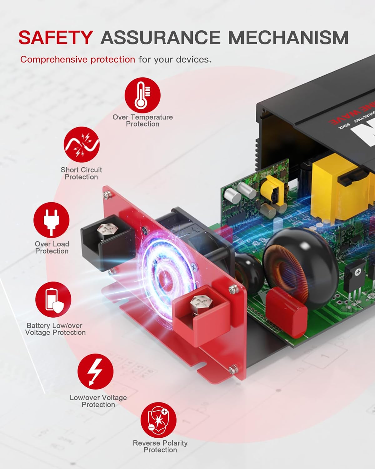 - 🚙COMPREHENSIVE PROTECTION MECHANISM: Isolated Voltage Protects Perfectly for your device from Over-voltage, Under-voltage, Overheat, Overload, Reverse Polarity, Short circuit. These intelligent safety features ensure the device operates safely under various conditions while effectively extending the inverter’s lifespan.
