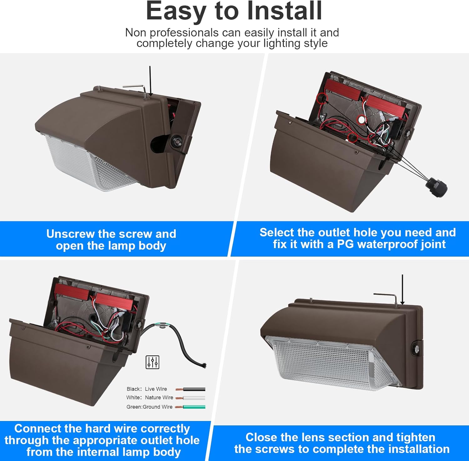- Safe wallpack led light - High-quality and efficient drivers ensure you can use them with more confidence, with multiple protective functions to prevent safety issues such as flickering, leakage, and overvoltage. Its stable and reliable performance can ensure the long-term stable operation of the led wall pack with photocell at AC100-277Volt, providing excellent security lighting for both indoor and outdoor