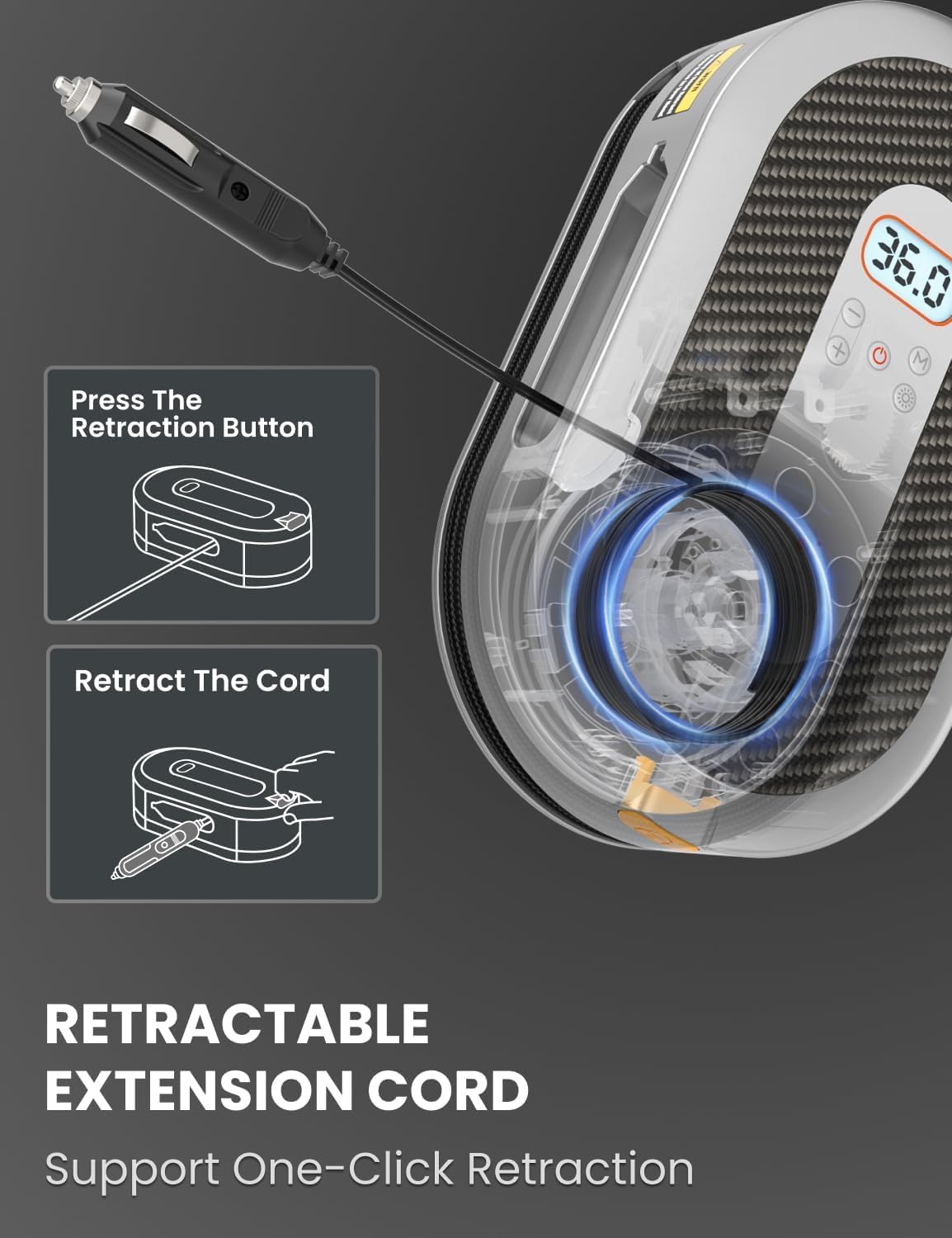- Retractable Power Cord: Say goodbye to tangled power cords with the automatic retractable power cord system on our tire inflators. Press the Tangelo button and the cord automatically retracts.