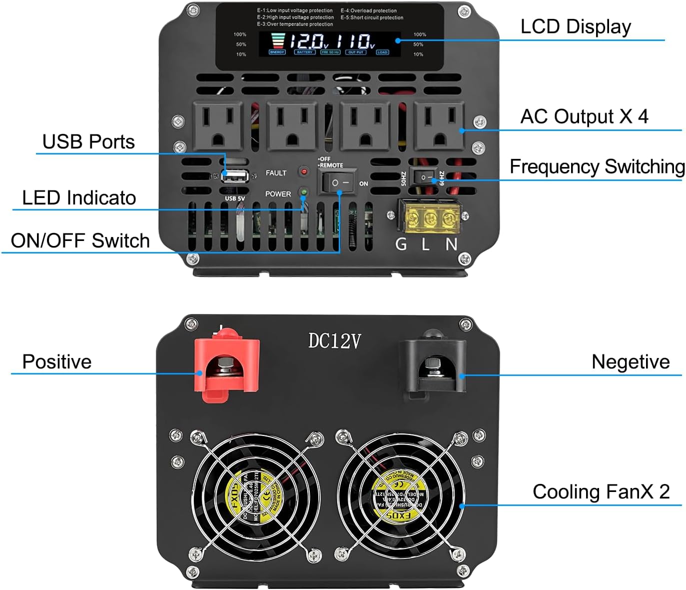 - 【Smart Cooling Fan + Full Safety Protections】Built-in intelligent cooling fan activates only when internal temperature exceeds 104°F(40°C) or load exceeds 45%, ensuring quiet operation and optimal heat dissipation. Includes protections for over/under voltage, overload, short circuit, reverse polarity, and overheating