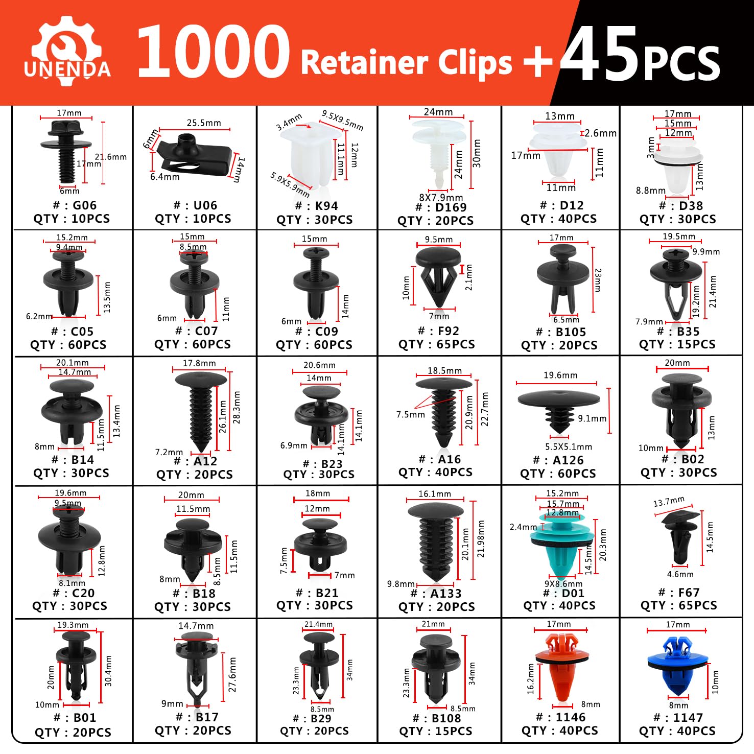 - UNIVERSAL AUTOMOTIVE CLIPS KIT: 1045 PCS great assortment push retainer kit including 30 most popular sizes, 4 different kinds tools with 1 Red Fastener Remover, fitting for door trim, radiator shield yoke, fender, bumper, side skirt, grille, engine cover and splash shield retainers replacement,compatible with Ford, GM, Chrysler, Toyota, Honda and more