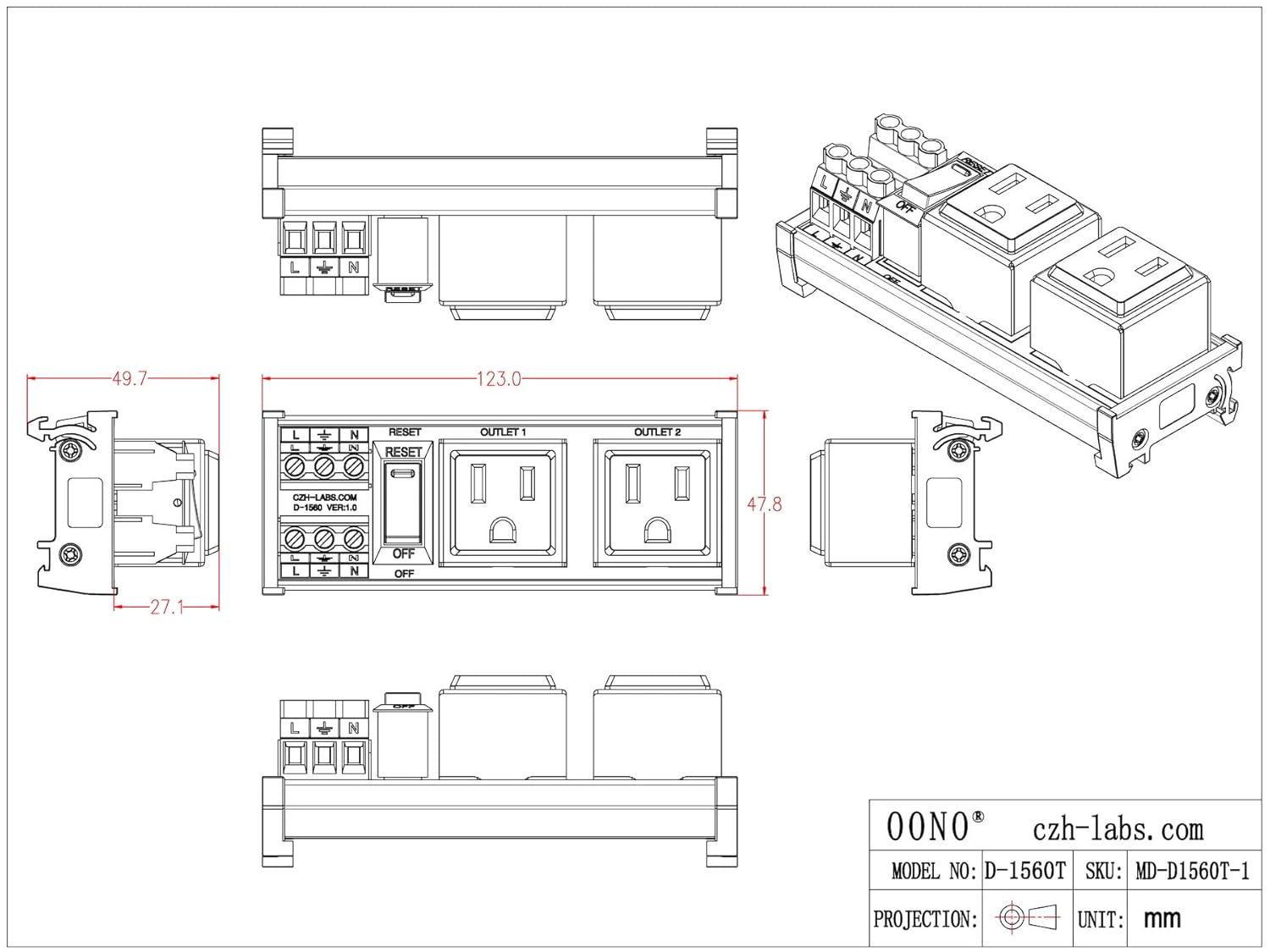 DIN Rail Mount AC 120V NEMA 5-15R Double Receptacles Outlet Power Strip Module, with Rocker Switch Thermal Circuit Breaker Overload Protector