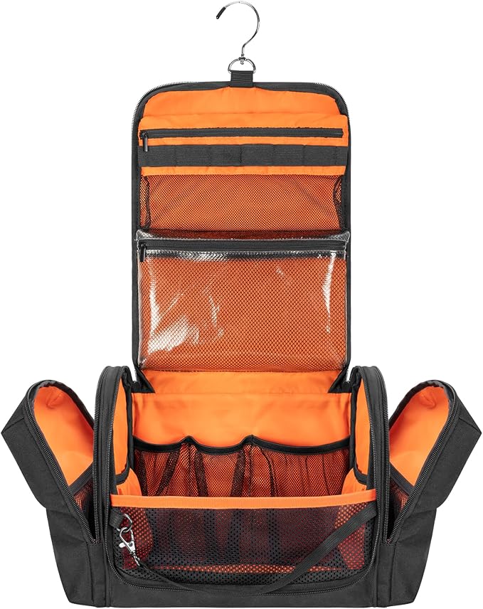 - WELL ORGANIZED: Roomy main compartment with 5 elastic pouches and 2 zipper pockets to keep your shampoo, razor, skin care products organized and tidy. The interior height of 9.2 inches allows to place bottles vertically. Bright orange lining for easy to find what you need at a glance.