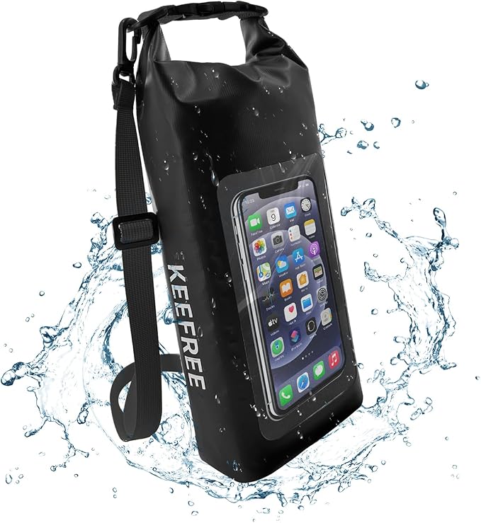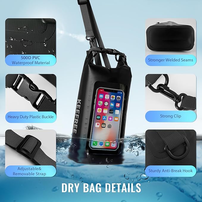 - 【HIGH QUALITY MATERIAL】KEEFREE waterproof dry bag is made from high-quality ripstop PVC (IPX7 rating) with sturdy welded seam which proves to be sturdy, safe and protects your items when outdoors.Solid roll-top closure system provides a perfect seal and keeps out water, snow, dust, sand, and dirt.The buckle and D-rings are made with upgraded POM material, making them stronger and more firm for frequent use