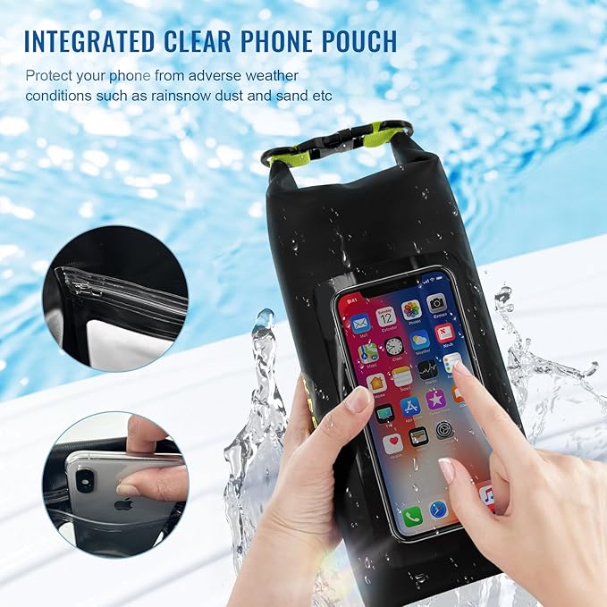 - 【INTEGRATED CLEAR PHONE POUCH】The designated waterproof compartment is made of high-quality material and allows easy storage and carrying of your phone (up to 7" screen in diagonal size),allowing you to stay connected and protected with designated touch screen access for checking messages or emails without the hassle of removing your device. Note: The clear phone pouch is individually sealed and full protected