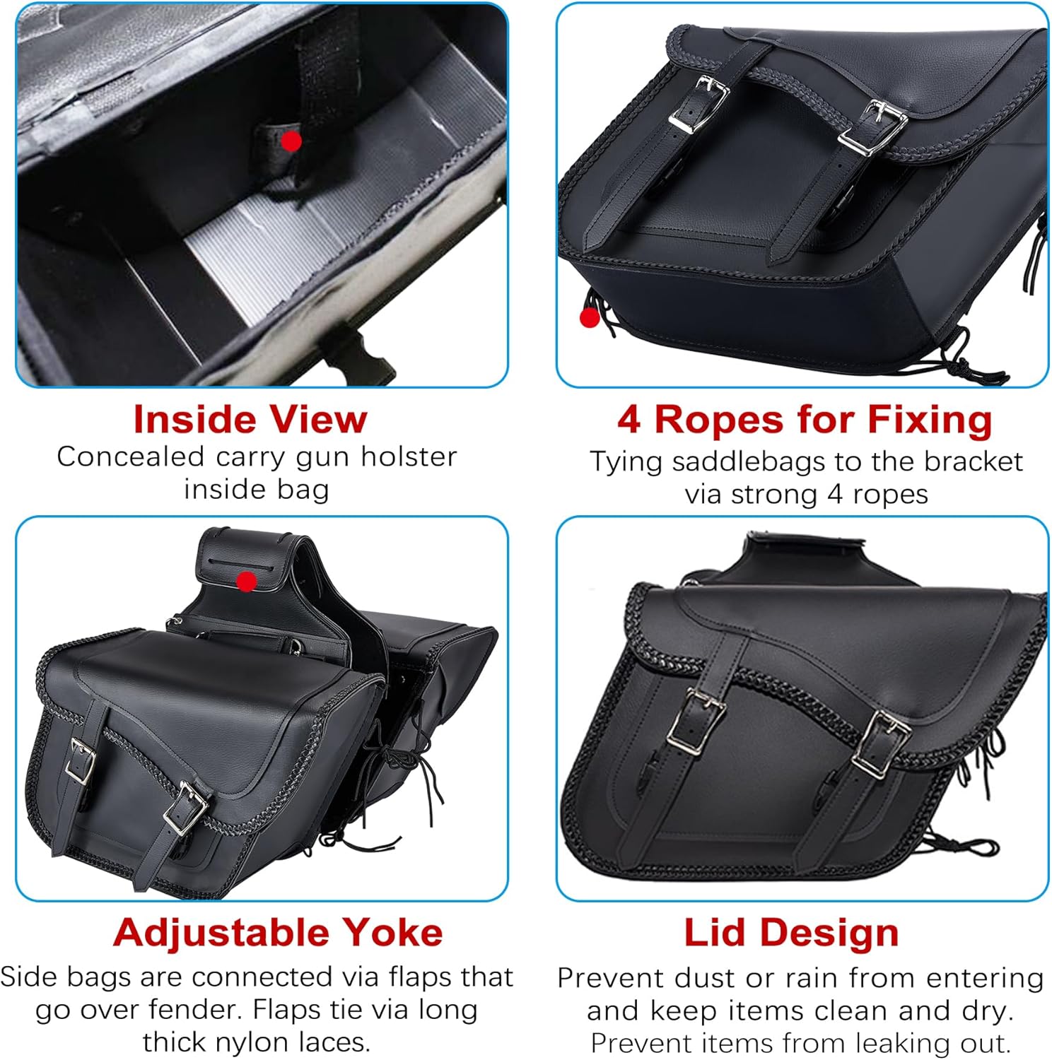 - [Fashion Appearance and Flap Design] - Thin braiding is built along edges and makes the saddlebags more fashion. The black saddle bags will give your motorcycle a new look while also greatly expand practicality of bike. Flap design and strong stitching make sure that the saddle bags will not lose luggage when riding fast on bumpy roads. Flap design helps prevent dust or rain from entering and keep items clean and dry.