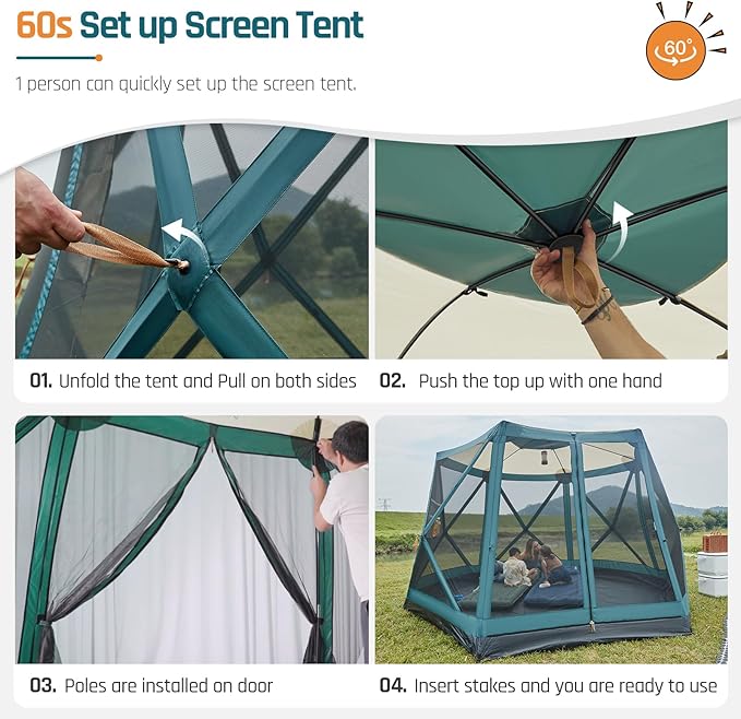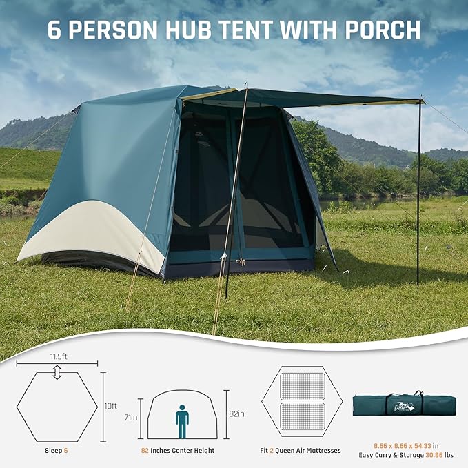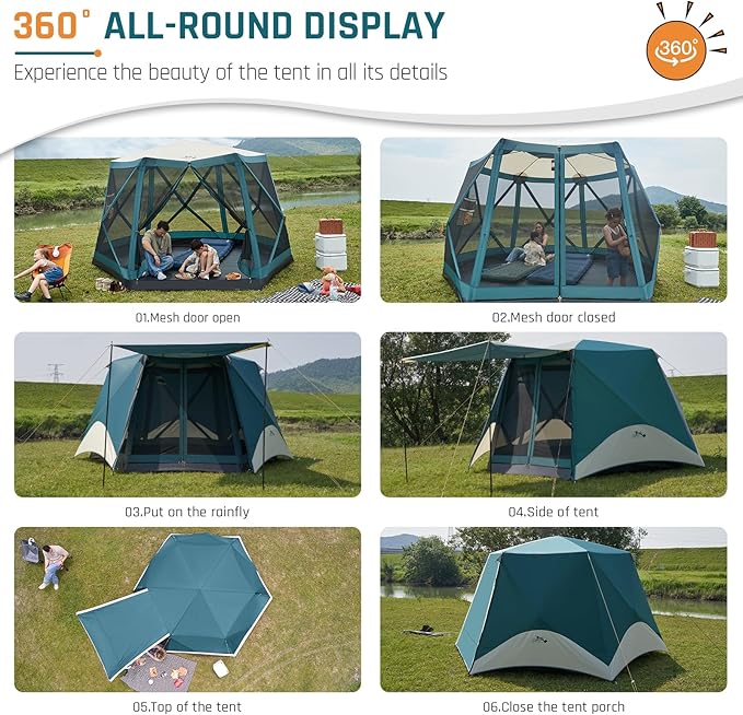 - Instant Pop Up Screen Tent with Porch, 11.5' L x 10' W x 82" H, 6 Person Camping Tent with Floor, Large Family Tents Screen House Room with Rainfly, Hexagon Hub Tent, Easy Up Tent for Outdoor Camping Picnic