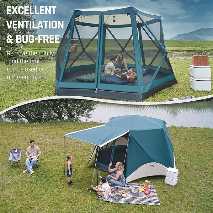 - 2-in-1 Camping and Screen Tent: This innovative 2-in-1 camping tent easily converts from a camping tent to a screen gazebo. With the rainfly on, it's a water resistant camping tent; remove the rainfly, and it becomes a screen tent with excellent ventilation, perfect for bug-free outdoor enjoyment.