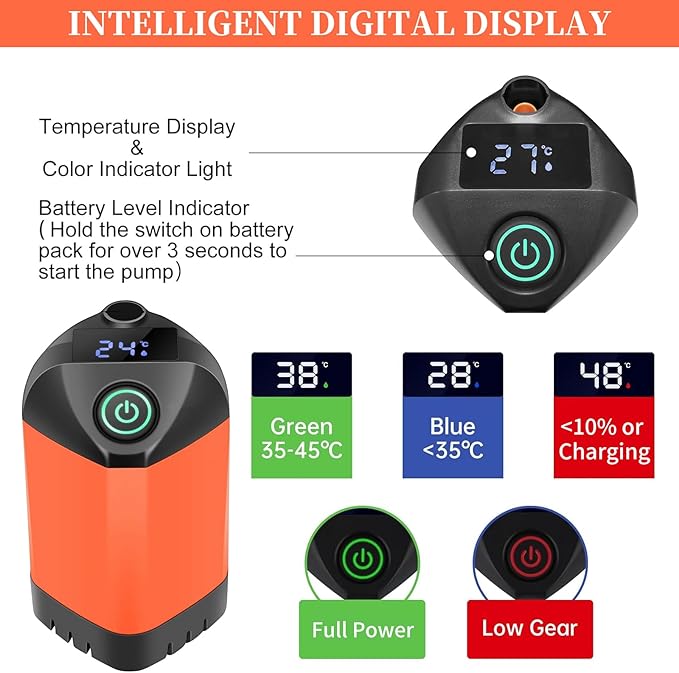 - 【Intelligent Digital Display】The portable shower pump real-time power level display and temperature display, applicable range 32-140°F, (the indicator light is "GREEN" when the water temperature is 35-45℃ ; and "BLUE" when the water temperature is below 35℃; and "RED" when the water temperature is higher than 45℃). Gear indicator light help you switch between high and low gears, red light indicates high gears and high water output; green light indicates low gears and low water output.
