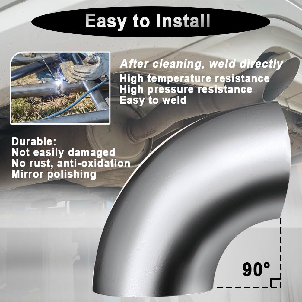 - [Parameter] High-quality SS304 stainless steel 90 degree exhaust elbow pipe, Caliber outer diameter is 2.5 inch/63mm. Thickness: 1.5 mm. Back arc length: 5.9 inches/150mm (can be welded to 2.5 inch outside diameter pipe)