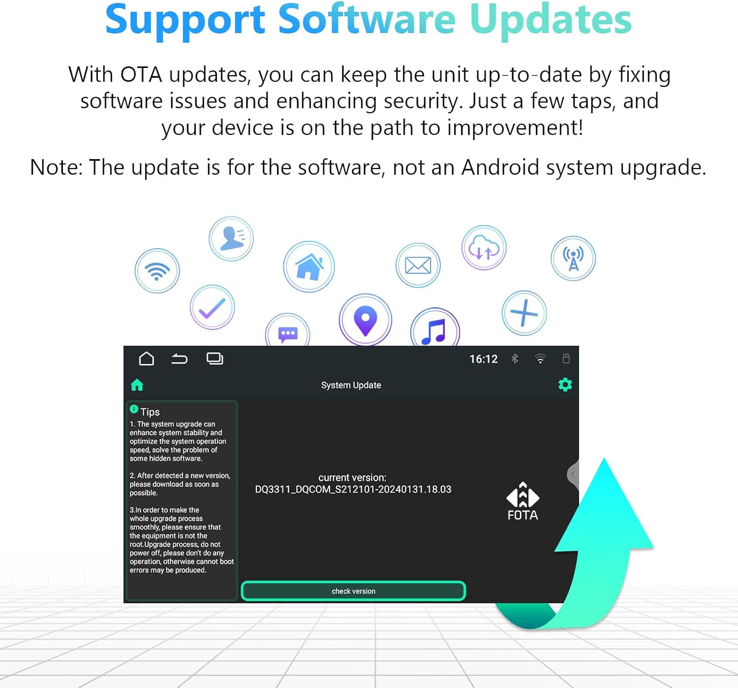 - 【Latest Android 13 System】Built-in with the latest Android 13 (API level 33), paired with a cutting-edge Rockchip processor for superior performance and energy efficiency, the E46A13 double din car stereo outperforms conventional other car stereo with 8-core processors. Eonon offers convenient online firmware updates, you don't need a USB stick to upgrade.