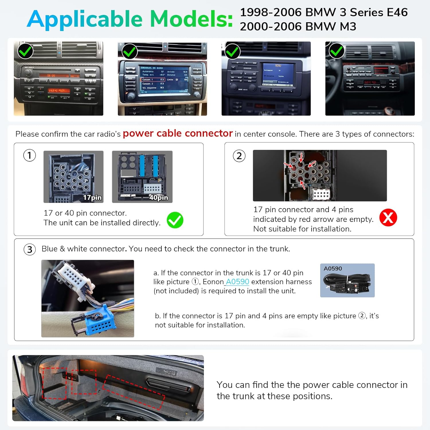 - 【Install NOTE】If you car power cable connector is 17-pin connector, but 4 pins are empty, it's NOT suitable; 17-pin connector and doesn't have the empty pins or 40-pin connector , E46A13 can be installed directly; If the connector in the trunk is 17 pin or 40 pin, you need EXTRA buy Eonon A0590 extension harness to install.